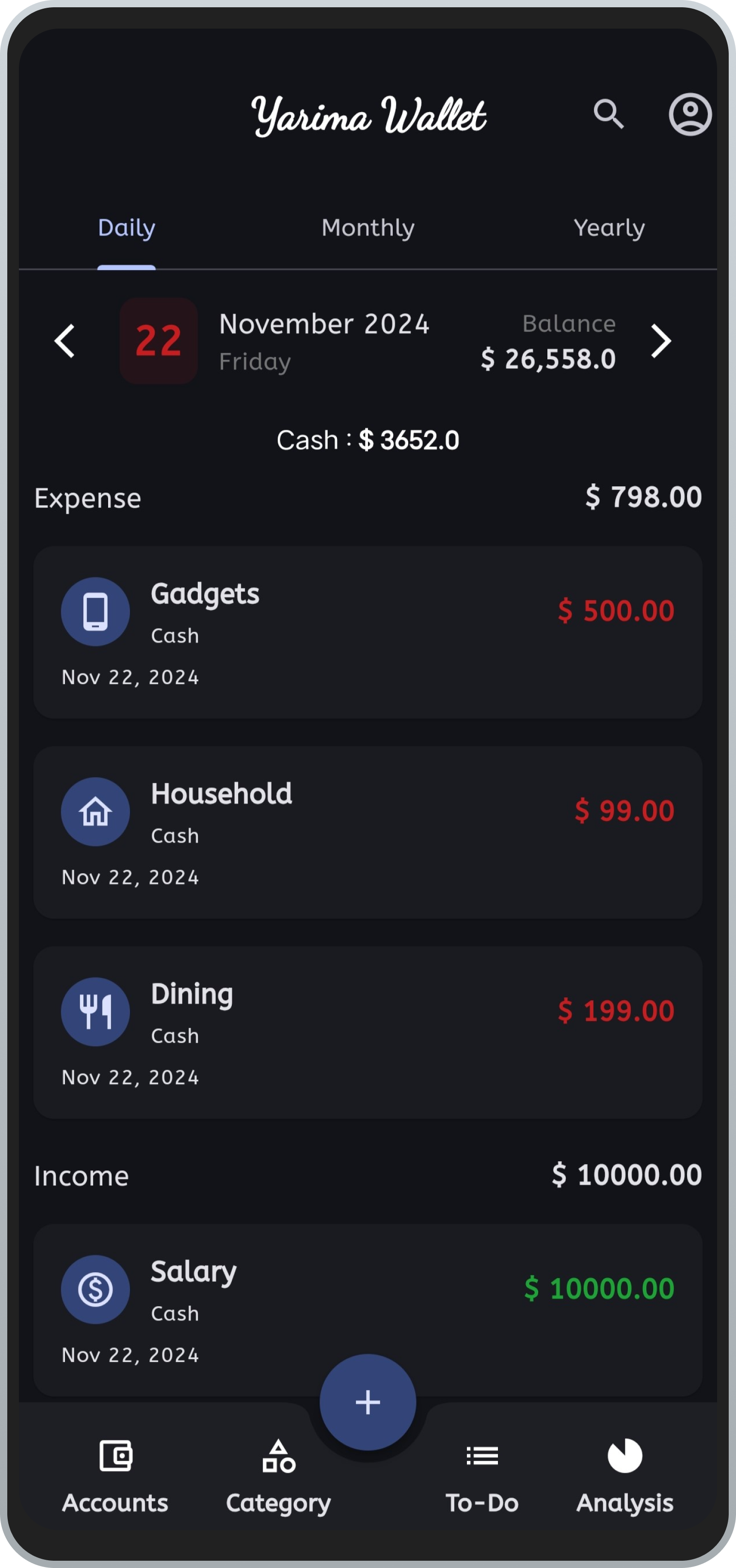 Yarima Wallet is a digital expense tracking application that helps you manage your finances effectively by recording and analyzing your daily expenses and income.